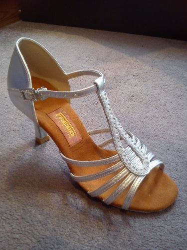 Adorable, silver sparkly dance shoes. Heel height 2.5".