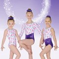 Round neck, long sleeved leotard with smooth velour/lycra body and hologram print panel and sleeves.