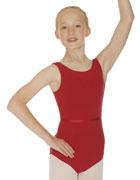 Sleeveless shiny nylon/lycra leotard with gathered bustline.