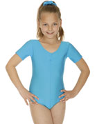 Short sleeved nylon/ycra leotard with gathered bustline.